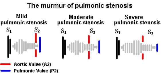 第二心音由主动脉瓣、肺动脉瓣关闭产生,如果存在狭窄,瓣膜关闭时间会延长,临床上表现为第二心音延长 - Mild PS seldom progresses; seldom symptomatic (ie no reduction in exercise tolerance)