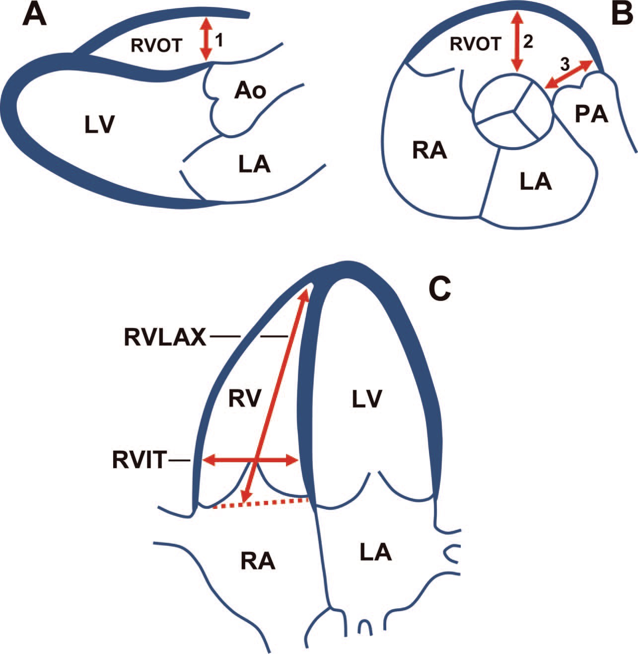 Echocardiographic measurements of right ventricular dimensions. (A) Parasternal long axis view. (B) Parasternal short axis view. (C) Apical four chamber view. Ao, aorta; LA, left atrium; LV, left ventricle; PA, pulmonary artery; RA, right atrium; RV, right ventricle; RVIT, right ventricular inflow tract; RVLAX, right ventricular long axis; RVOT, right ventricular outflow tract.