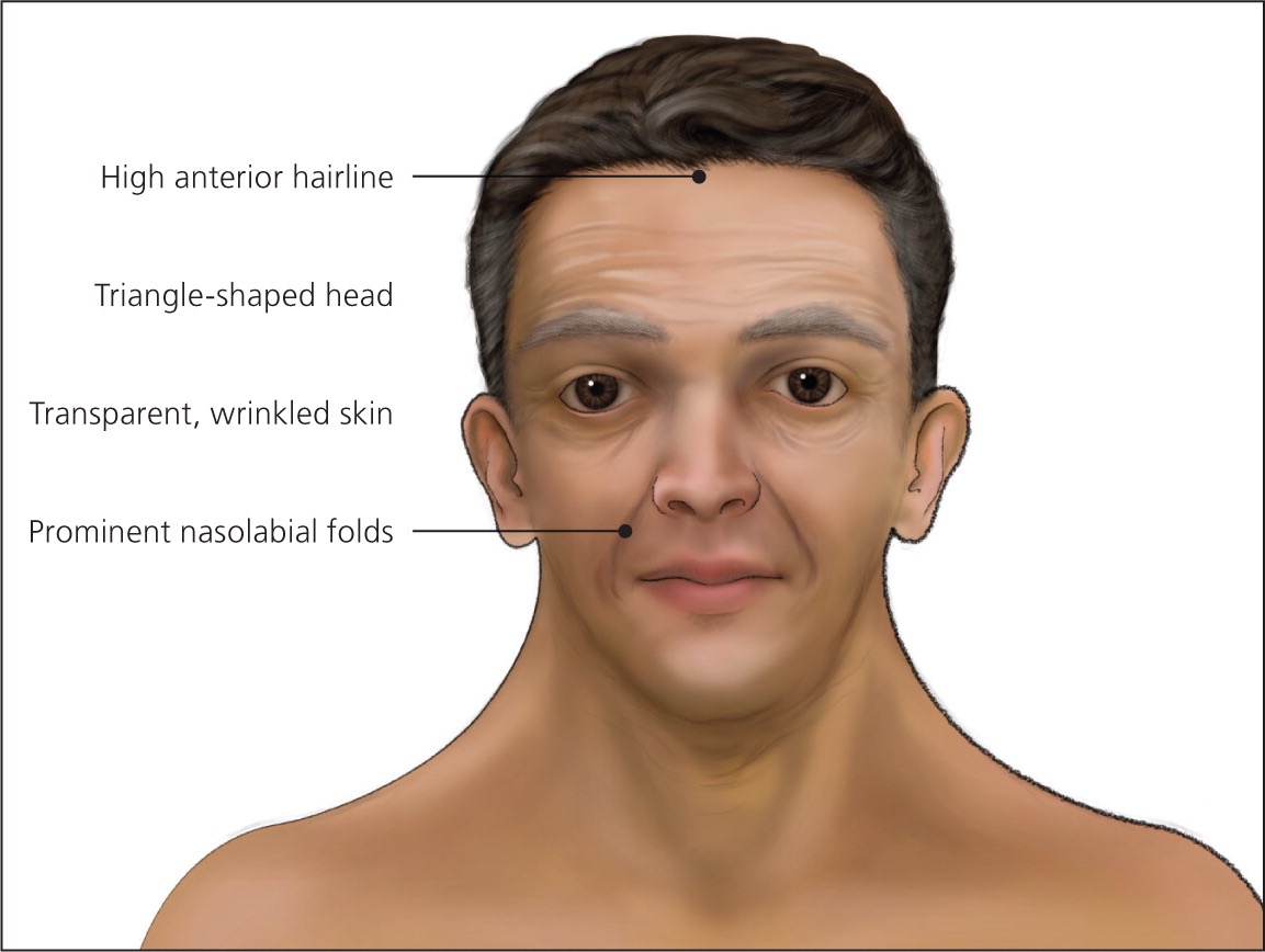 Noonan | PTPN11, SOS1, aberrant RAS-MAPK-signalling, heterogeneous trait | Dysplastic pulmonary valve stenosis, supravalvular pulmonary stenosis, hypertrophic cardiomyopathy | Short stature, hypertelorism, downward eye slant, low set ears |